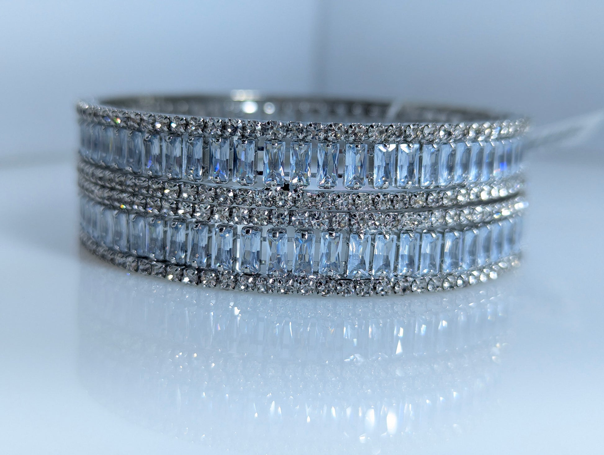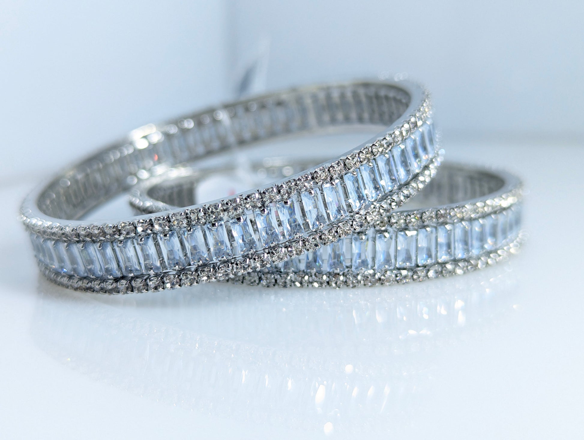 Sparkle in style with this stunning silver bangle, meticulously studded with premium American diamonds for a look that dazzles like real diamonds. The flawless baguette and rectangle stones offer brilliance and grace for every occasion, bringing sophisticated luxury without the high price tag.